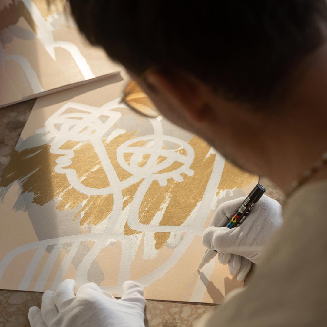 The Golden Hour Series" is an collection of silkscreens, created by contemporary artist Pablo Lucker available in a variety of sizes. Each piece is a handcrafted marvel, composed of 7 applied layers, featuring the use of special gold and silver inks. This unique blend of materials not only enhances the visual appeal but also adds a luxurious touch to the artwork.